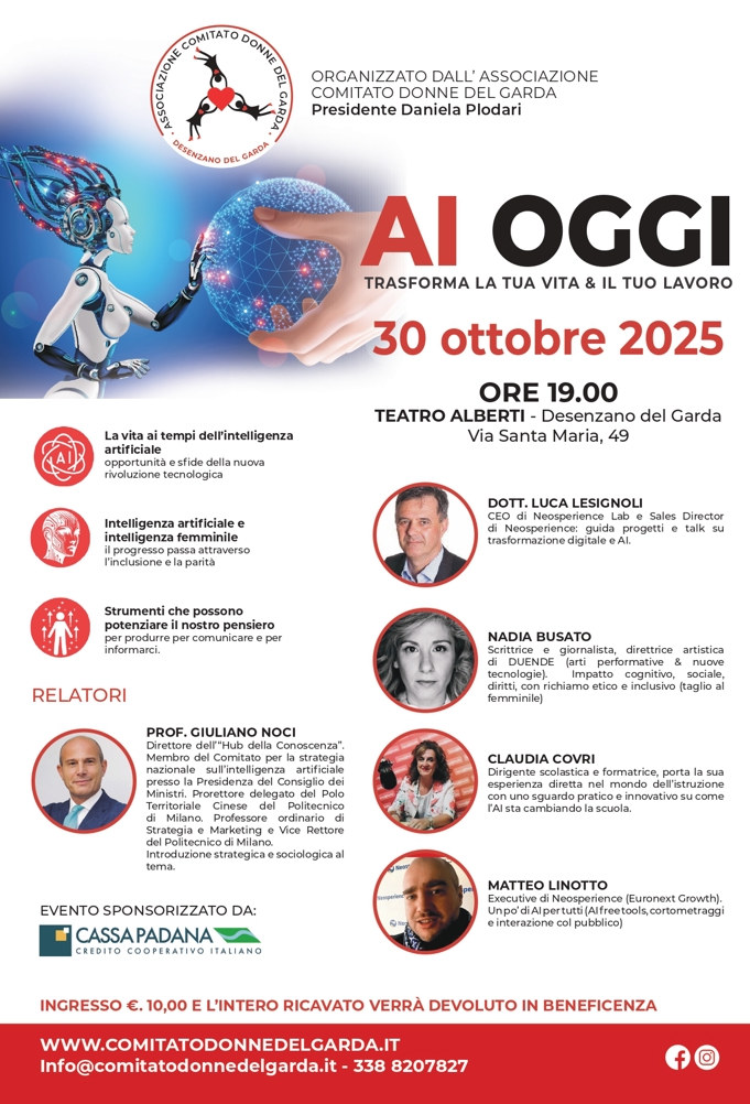Appuntamento il 30 ottobre a Desenzano del Garda con il convegno "AI oggi. Trasforma la tua vita e il tuo lavoro" promosso dall'associazione Comitato Donne del Garda e sostenuto da Cassa Padana.