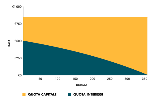 Per questo, il piano di ammortamento si presenta come nel grafico sotto: la rata è sempre la stessa (circa 843 euro) lungo tutta la durata del mutuo (360 mesi), ma la quota di interessi (area blu) si riduce nel tempo, mentre la quota capitale (area gialla) cresce gradualmente.